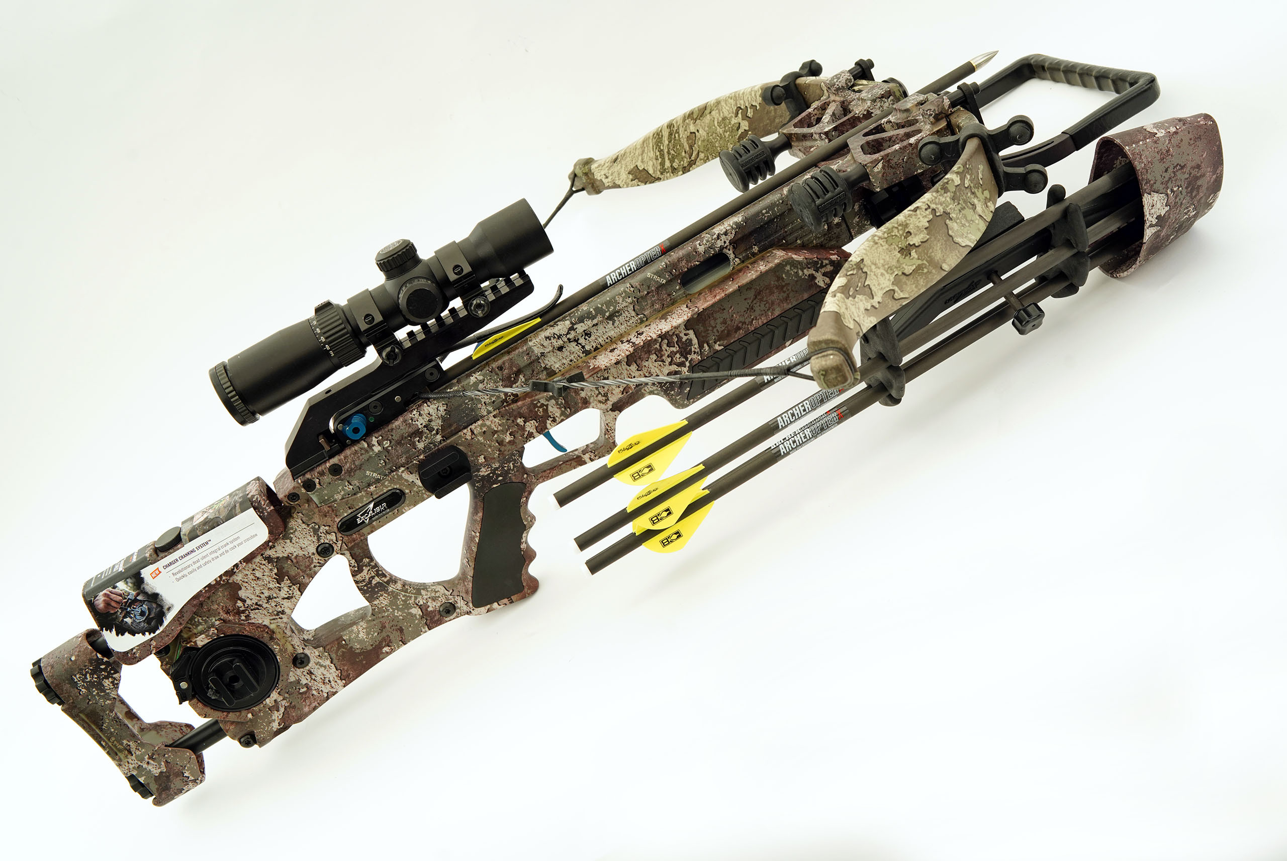 Dazu zählt die absolute kompakte Bauweise, der neue integrierte fast lautlose Kurbelspannmechanismus, der neue 2 Stufenabzug, die verstellbare und gleichzeitig integrierte Schulterstütze und Wangenauflage. Alle bei Excalibur verfügbaren Dämpfungssysteme sind bereits verbaut. Das Spannen mit der Kurbel erlaubt auch einen Bogen mit 285 lbs Auszugsstärke zu bedienen aber man kann zur Not auch noch mit einem normalen Spannseil laden.