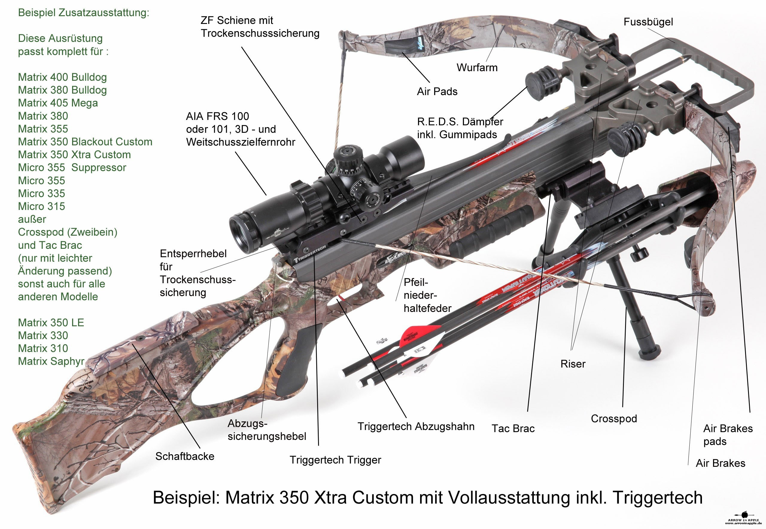 Die Matrix 350 Camo Extra Custom ist ein limitiertes Sondermodell. Sie ist nicht zu stark und nicht zu schwach genau das Richtige für den Recurve- Armbrustschützen, der etwas von Langlebigkeit hält. Sie schiesst präzise wie alle Excaliburmodelle und kommt mit einer hervoragenden Ausstattung. Air Brakes und Zweibein sind zwar optional, dafür gibt es die Trockenschusssicherung, die Schaftbacke, die R.E.D:S. Dämpfung, Anbau Köcher, 3 Pfeile, Spannhilfe, deutsche Bauanleitung und je nach Paket das 2-6 x 32 DeadZone Zielfernrohr oder das AIA FRS 101 ZF.