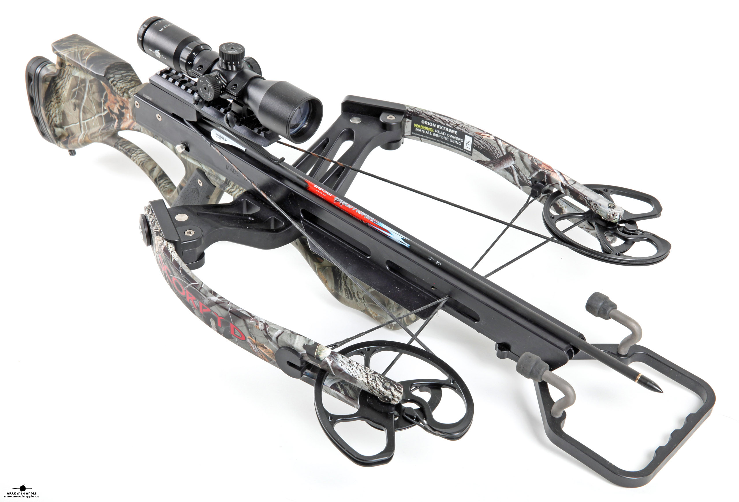 Die ORION EXTREME gehört zusammen mit der und der VTEC EXTREME und der VENTILATOR EXTREME mit zu den 3 zweitschnellsten Armbrüsten der Welt. Bis zu 440 fps oder 484 km/h schnell kann der Pfeil bewegt werden. Angeboten wird hier das Foto oder und Vorführmodell. Sie schießt sich sehr angenehm, ohne größeren Prellschlag und außerdem sehr leise für diese Geschwindigkeit. " Sehr leise " kann man immer dann behaupten, wenn der Einschlag ebenso so gut oder besser zu hören ist wie der "Abschlag" bei einer sehr guten Zielscheibe vorausgesetzt. Die Orion Extreme und die Ventilator Extreme besitzen den gleichen schmaleren Bogen der 3 Extreme Modelle unterscheiden sich jedoch im Schaft. Die Orion besitzt einen starren Schaft mit gummierter Schulterstütze. Eine Kurbelspannhilfe wird nur in der nächst kleineren Version (160lbs) angeboten. Die Armbrust besitzt ein perfekt und sehr sauber arbeitendes Schloss, welches manuell gesichert werden muss. Auf 60m sind freihändig stehend, Gruppen innerhalb von 4-5 cm möglich. Die Orion kommt mit je einem Dämpfersatz für die Wurfarme und für die Sehnenstopper. Gespannt wird sie mit einer beiliegenden Seilspannhilfe ("Ded Sledd 50"), welche 50% Zugerleichterung für den Anwender bringt. Abgerundet wird das Paket mit dem AIA FRS 101 Zielfernrohr, was für Spass auf Jagd, 3 D und Zielscheiben Distanzen bis hin zu 175 und mehr sorgt. |