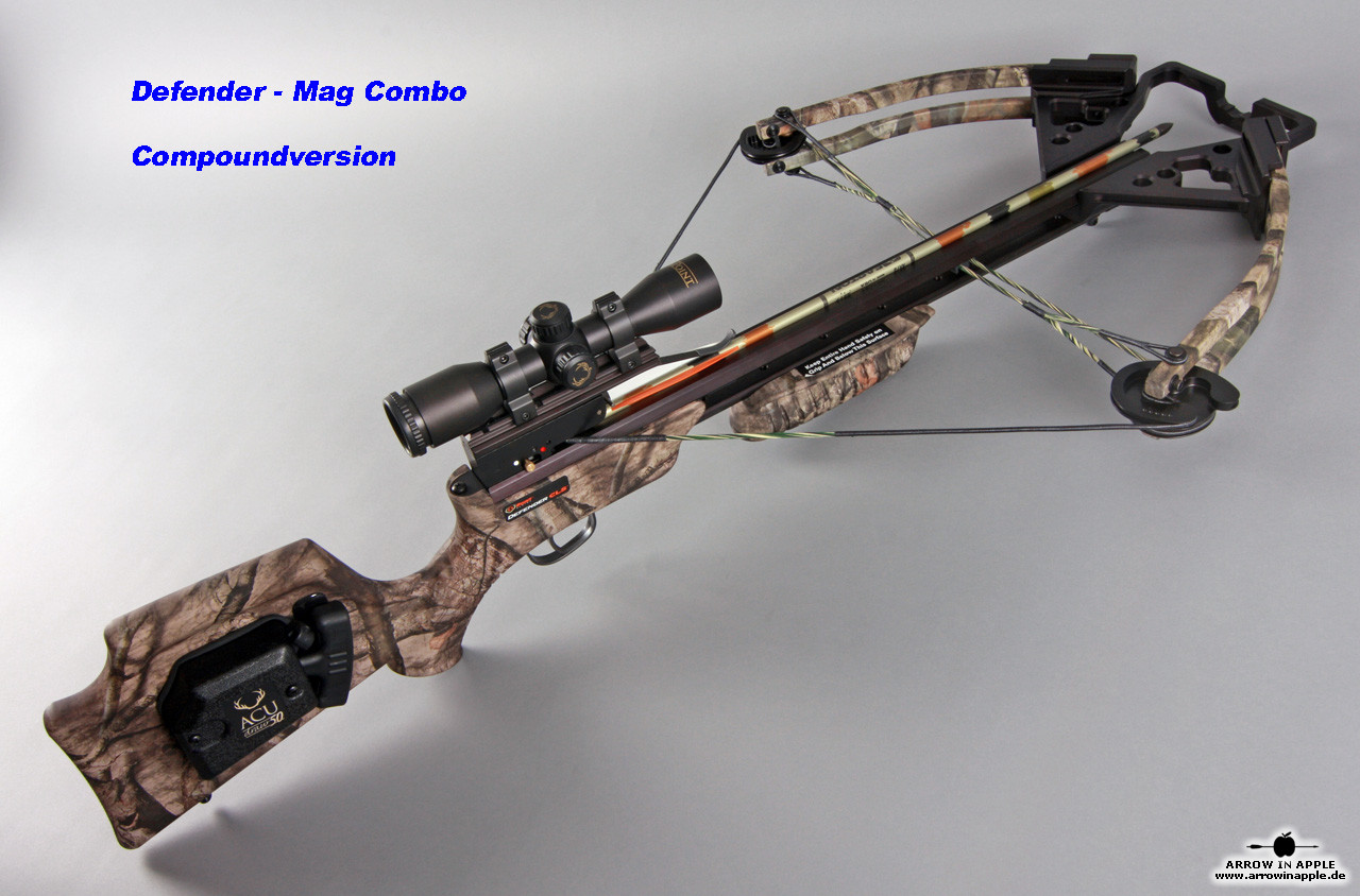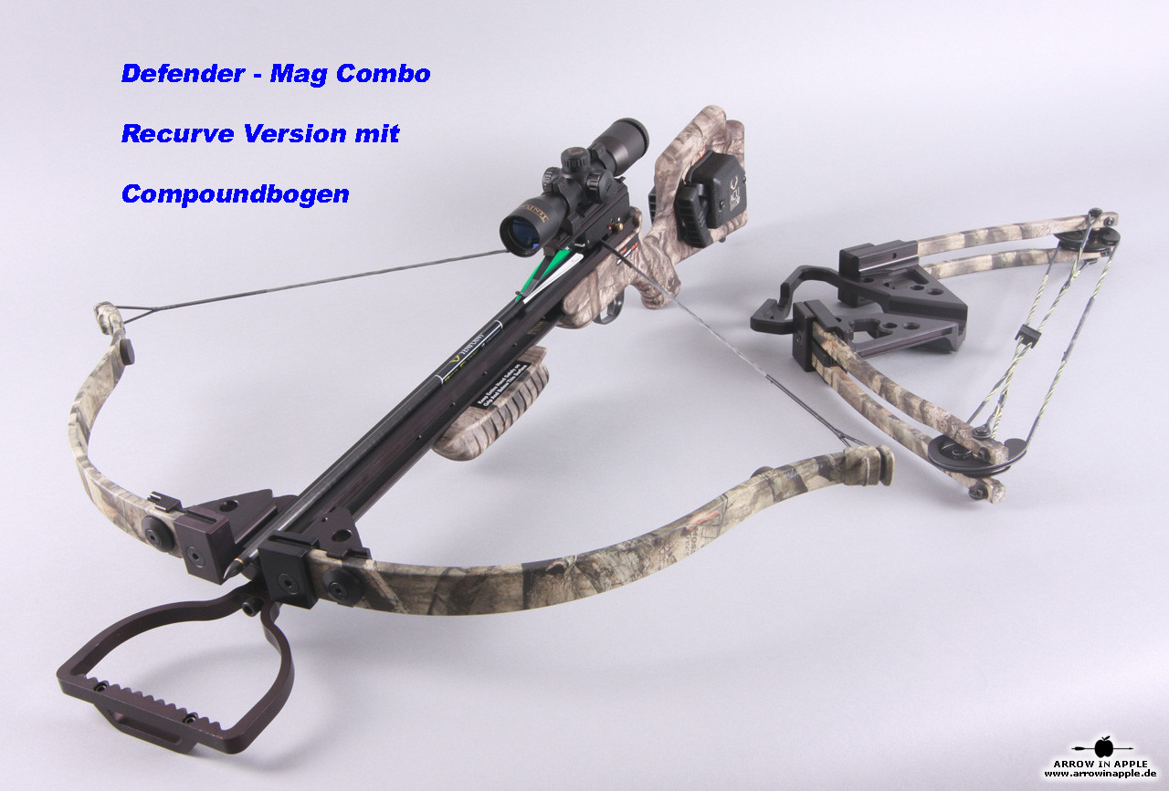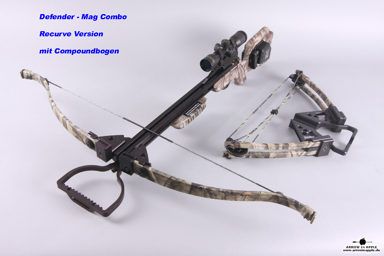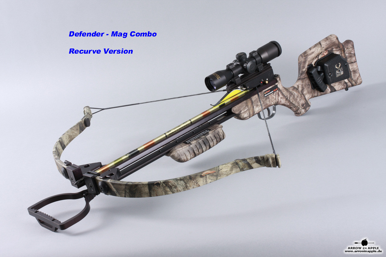 Zum ersten Mal bietet ein Hersteller für eine Armbrust 2 verschiedene und auswechselbare Bogensysteme an. Die Defender-Mag-Combo kann als starke (175 lbs) und schnelle Compoundarmbrust ähnlich der Defender- bzw. Phantom CLS oder als Recurvearmbrust ähnlich der GT Mag (200lbs) benutzt werden. Der Riser (Wurfarmblock) die Pfeilführungsschiene, die Zielfernrohrschiene + Sockel sind aus gezogenen - bzw. gefrästen Aluminium. Die arbeitenden Schlossteile und die aktive Trockenschusssicherung sind aus mehrfach gehärtetem Stahl . Alle Teile zusammen sind zu einem weiteren Topmodell von TenPoint verarbeitet worden. Da jeweils immer die gleiche Schiene bz. der gleiche Schaft verwandt wird, besitzen beide Varianten immer eine aktive Trockenschusssicherung und eine automatische Abzugssicherung mit dem perfekt, leicht arbeitenden und nach oben öffnenden Power Touch Triggersystem. (mittlerweile in allen TenPoint Modellen )