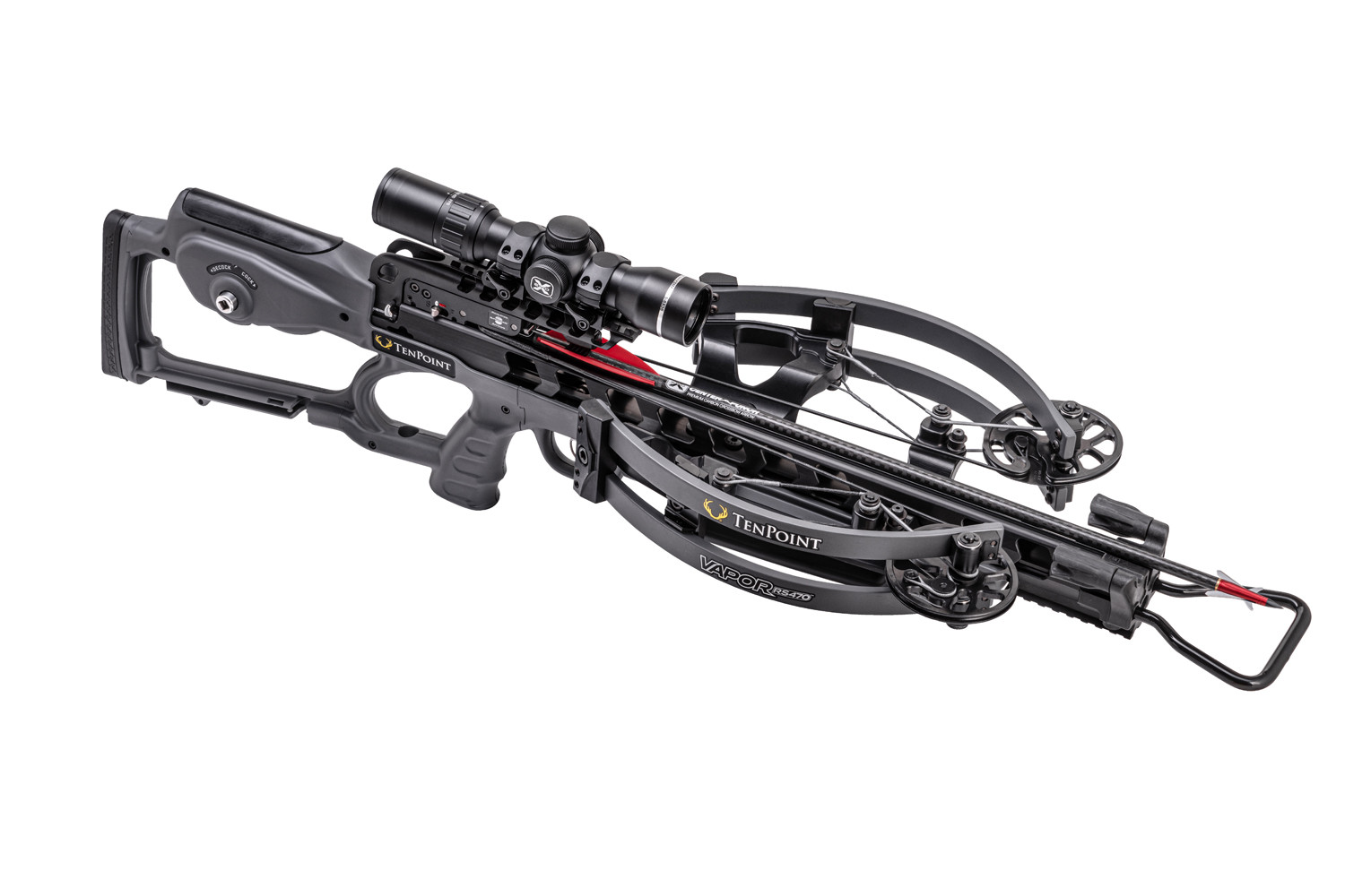 Die TenPoint Vapor RS 470 ist das Top Modell von TenPoint 2020. Eine äußerst sehr kompakte Reverse Draw Armbrust. Die Bogenbreite beträgt aber trotzdem im gespannten Zustand nur 6,5 Zoll bzw. 16,52 cm und in Kombination mit einer Auszugslänge von 17 Zoll, die sie in der Gesamtlänge über Alles von nur 88cm versteckt, ist sie die schnellste Armbrust auf dem Markt nach der Scorpyd Nemesis (diese ist dafür aber etwas größer). Sicheres Laden und auch Entladen (wenn nötig) ist wegen des lautlosen ACU Slide Spannmechanismus kein Problem. Die Treffergenauigkeit ist auf den Jagddistanzen bzw. im 3 D Sportbereich so extrem, dass immer empfohlen wird auf "Spots" zu schiessen, um die vorher abgegebenen Pfeile nicht zu beschädigen.