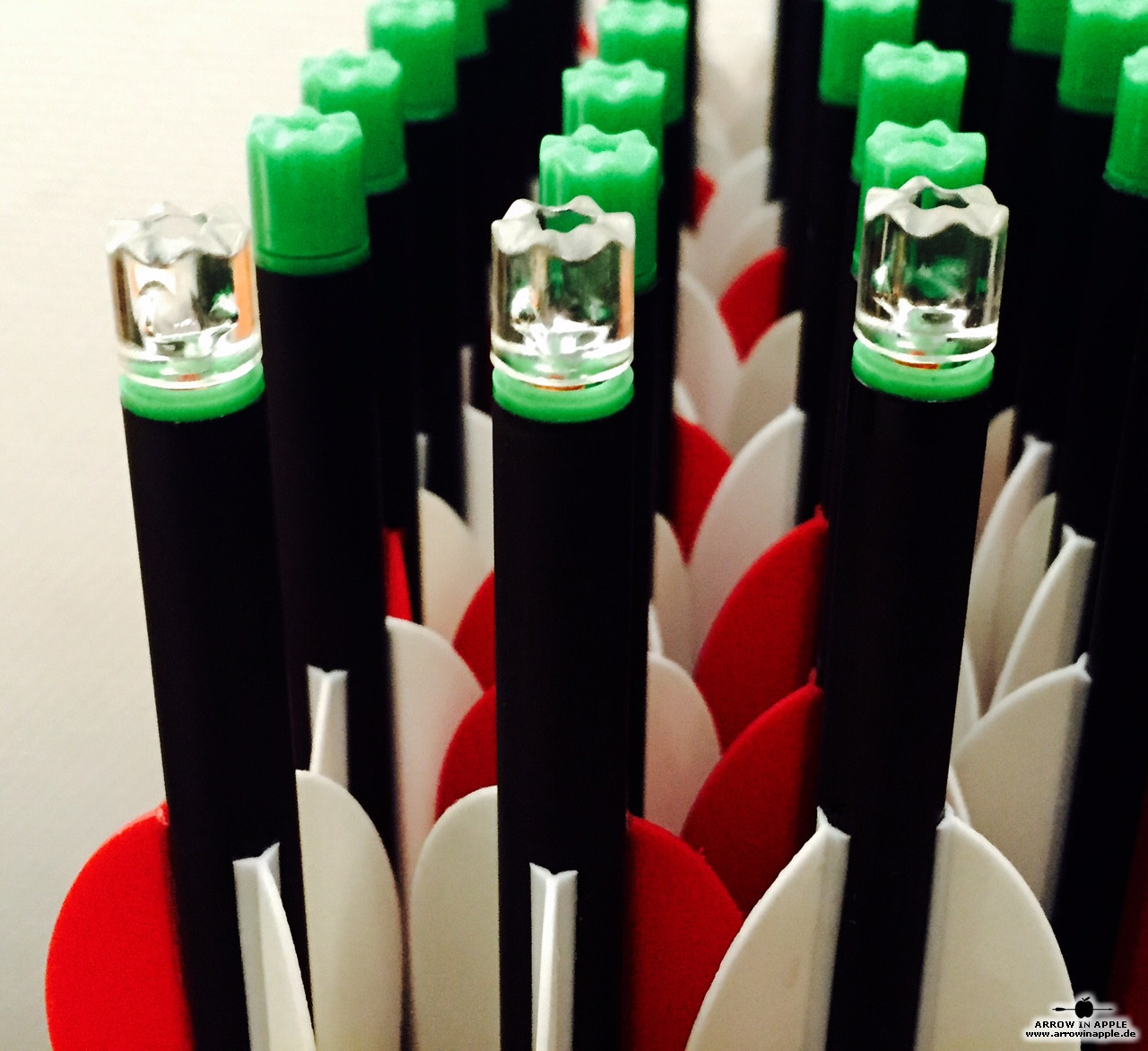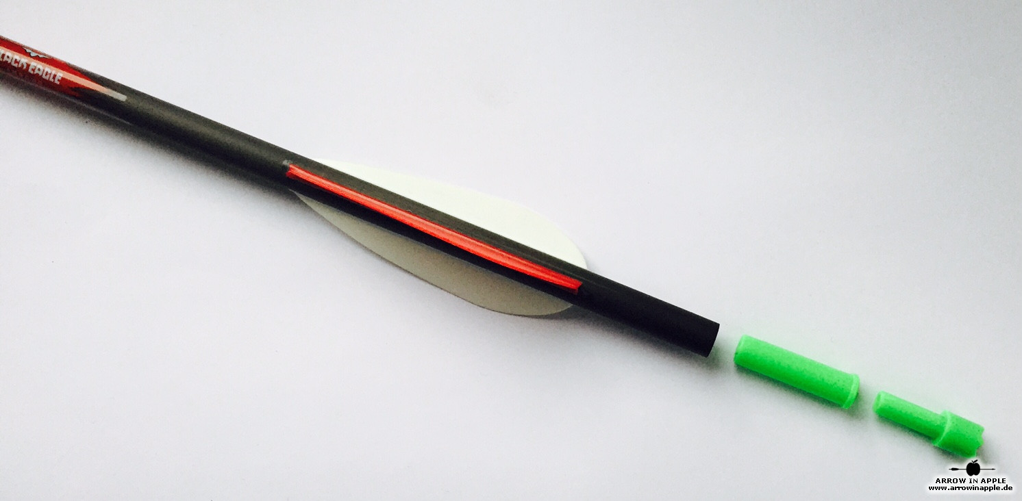 Der 20 Zoll Black Eagle Carbon Pfeil ist mit einem Omninocksystem ausgestattet, bei dem schnell und einfach die Endkappe durch Einstecken oder Herausziehen gewechselt werden kann. Das hat den Vorteil, dass z.B. Omni - Leuchtnocken ohne weiteres Einkleben und nur durch einfaches Austauschen verwendet werden können. Auch für die Verwendung anderer Endnocks wird dies später interessant werden, wie Halbmondnocks oder PSE Nocks usw.. Das bedeutet, man kann dann den selben Pfeil für verschiedene Armbrust Modelle mit wechselbaren Nocksystemen verwenden. Der Omninock ist ein Zwischending von Flach- und Halbmondnock. Gerade bei immer kompakteren Armbrüsten macht es Sinn Pfeile zu verwenden, bei der die im Schloss liegende, sehr spitzwinklige Sehne am Ende des Pfeiles Halt findet und nicht einfach über das Nockende hinweggleitet und einen " Leerschuss " fabriziert und den Armbrustbogen zerstört. Das Omninocksystem bietet gegenüber der herkömmlichen Omninock Endkappe den Vorteil, dass dieser gegen ein Leuchtstick mit farbloser Endkappe im Steckverfahren ausgetauscht werden kann. Demzufolge kann man einen herkömmlich Pfeil jederzeit in eine Leuchtpfeil verwandeln und umgekehrt. Der Nutzer braucht sich nicht auf einen Pfeil festlegen. Geliefert wird inkl. Spitze, Gewicht frei wählbar. (100, 125 oder 145 grain)