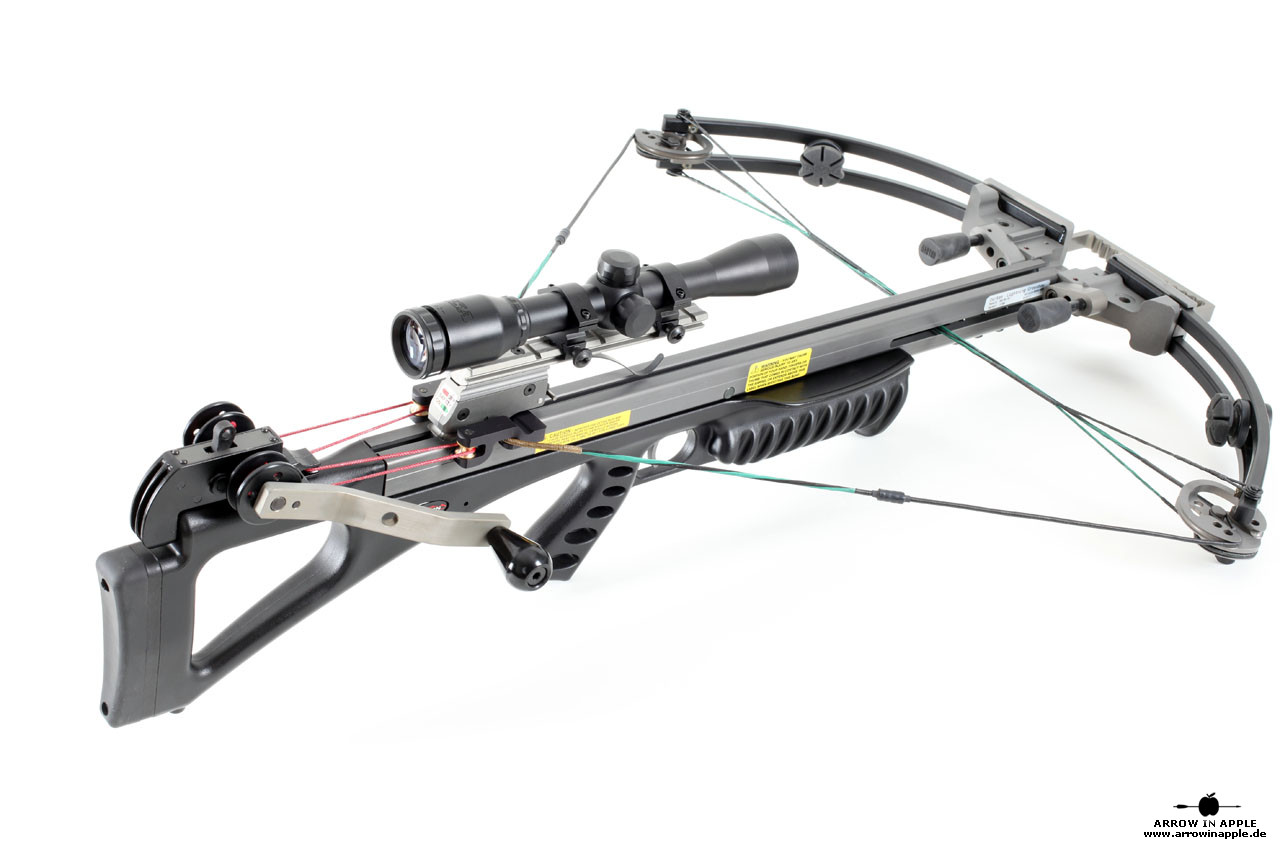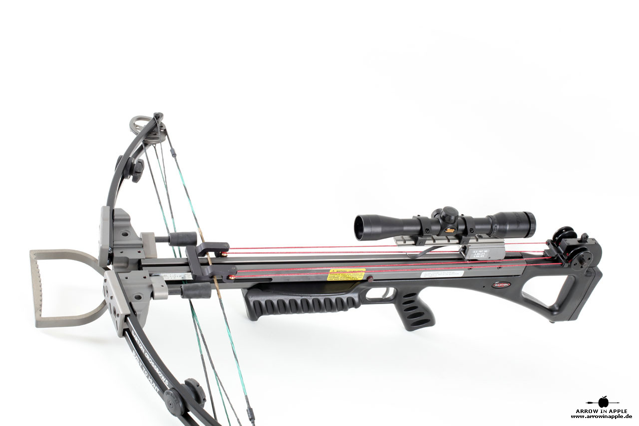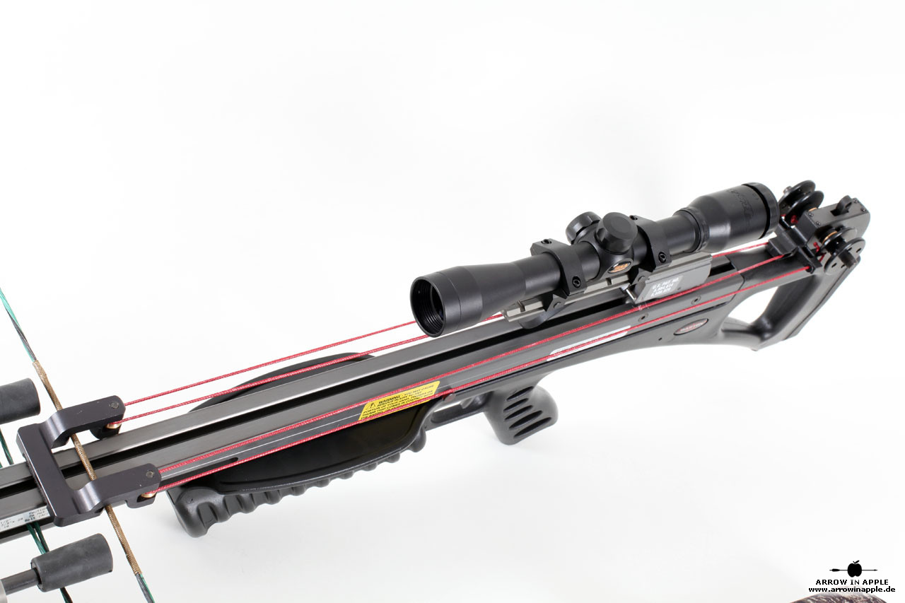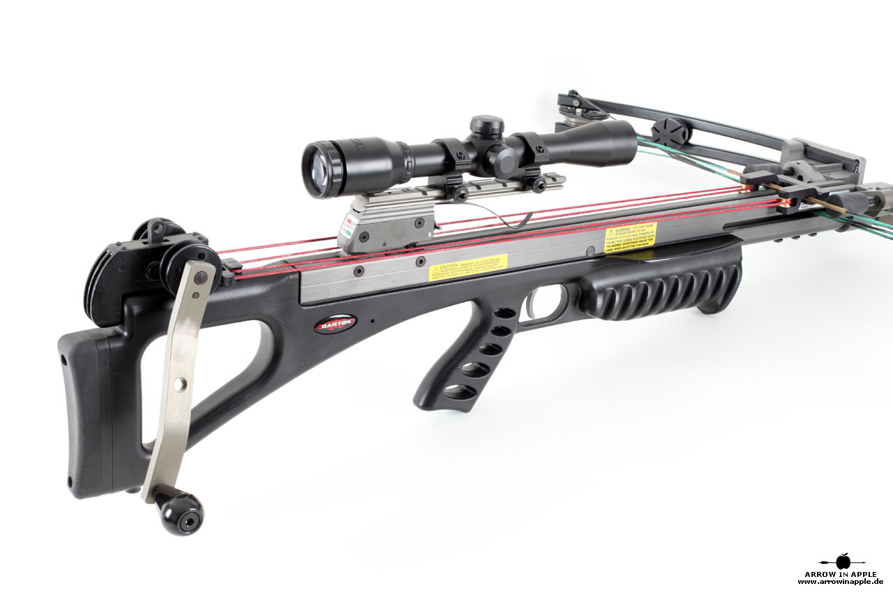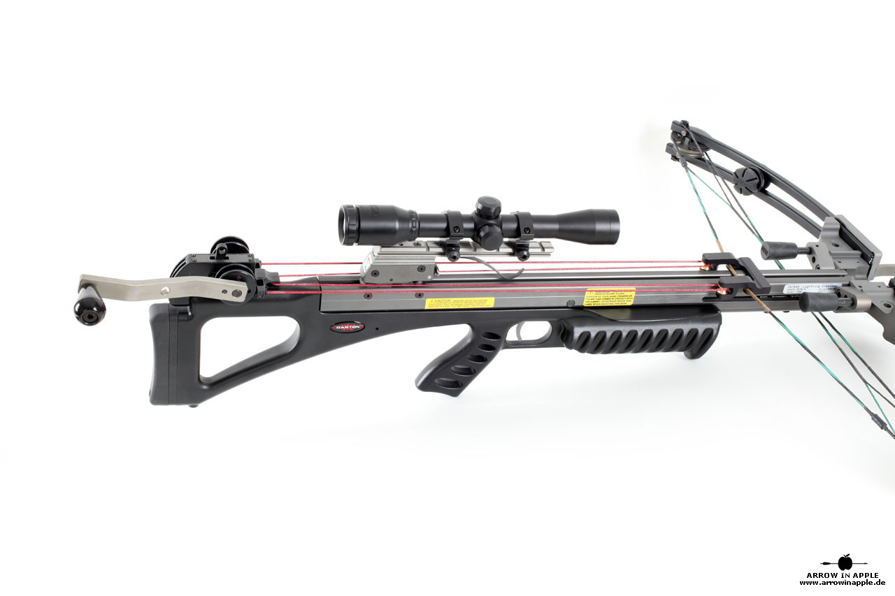 Zum leichten Spannen der Armbrust ohne Verwendung des Fußbügels, also besonders auch in Sitzposition.