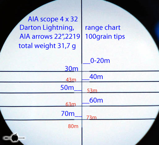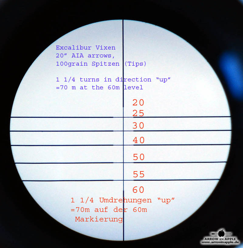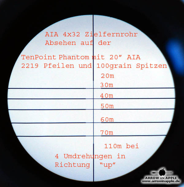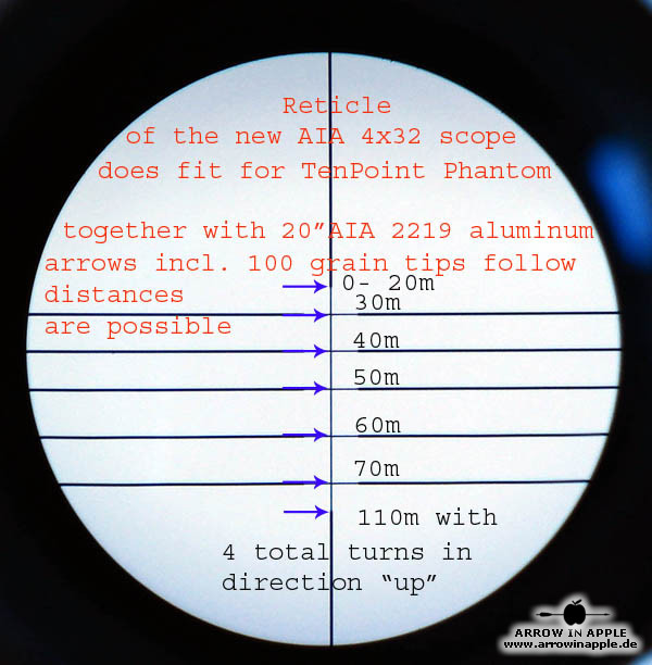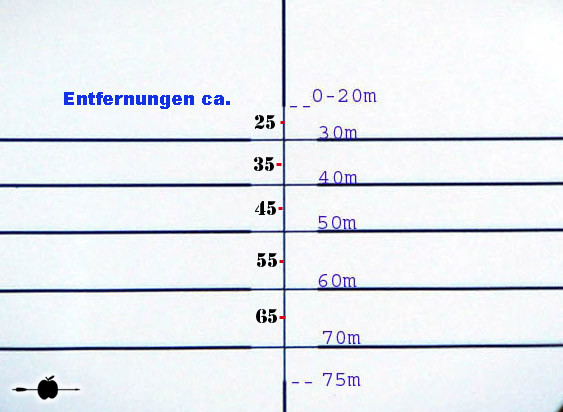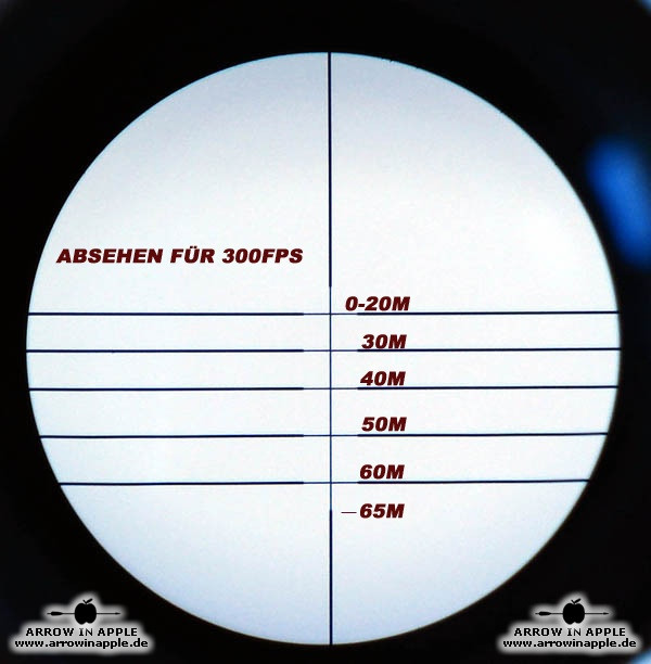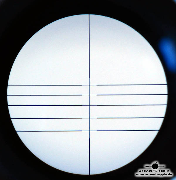 Universelles, prellschlagfestes, äußerst brilliantes und 281 g leichtes Armbrust ZF mit 5 Linien und 2 Punkten = 7 fixe unterschiedliche Entfernungen und einem Dioptrienausgleich ausgestattet. Einmal auf die kürzeste Entfernung eingeschossen, lassen sich in der Regel dem Absehen bei weniger schnellen Armbrüsten Entfernungen bis 60m bzw. bei den schnelleren Topmodellen bis 80m fest zuordnen. Das hat den Vorteil, dass Verstellfehler minimiert werden. Beispiele der Absehen, sind in der unten stehenden Bildergalerie zu finden. Trotzdem ist es möglich, nachdem die zugeordneten Weiten "ausgereizt" sind, noch mit Hilfe der Höhenverstellung des Armbrust Zielfernrohres selbst die Schussentfernungen je nach Modell bis auf 110m und mehr zu erhöhen. Durch die zusätzliche absolut kompakte und leichte Bauweise können wir das 4 x 32 Armbrust Zielfernrohr für fast alle Armbruste empfehlen. Das ZF wird mit Montageringen geliefert, die auf 22mm Weaver Zielfernrohrschienen passen oder auf Wunsch und ohne Aufpreis liefern wir auch passend für 11 mm ZF-Schienen. Verkauf solange der Vorrat reicht